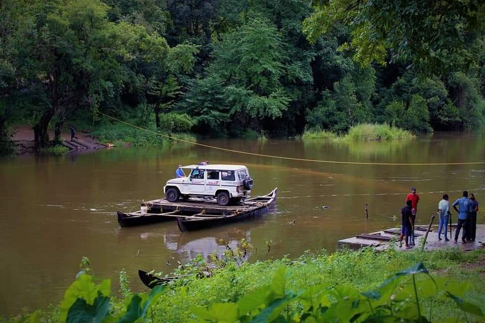 രണ്ടു വലിയവള്ളങ്ങൾ കൂട്ടിക്കെട്ടിയ താൽക്കാലിക ജങ്കാർ സംവിധാനത്തിലാണ്