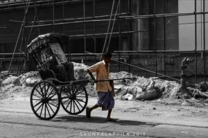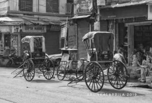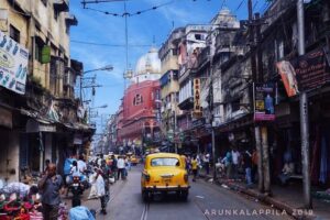 ഇന്ത്യയിലെ മറ്റു നഗരങ്ങളിലെ പാതകൾപോലെ തന്നെ കൊൽക്കത്തയിലും വാഹനങ്ങൾ കുരുങ്ങി മുറുകുന്നു. ഓരോ വഴിയിലും ഭൂതകാലത്തിന്റെ ശേഷിപ്പുകൾപോലെ തകർന്ന കെട്ടിടങ്ങൾ.